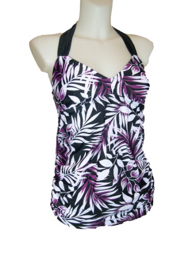 Beautiful 2 pc tankini swimsuit, done in vibrant purple/black and white tropical print.You will not be disappointed with